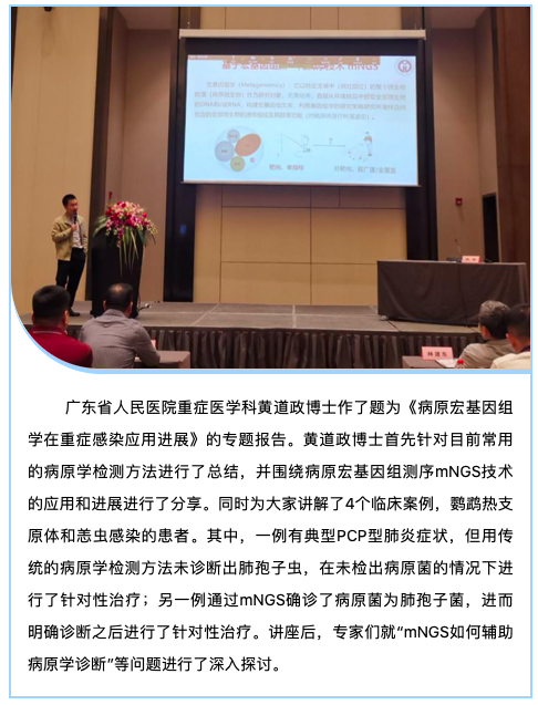 日前,福建省重症医学培训会——中国重症医学多学科精髓(MCCRC)培训班在福州召开。本次培训班邀请了省内外知名专家围绕重症医学领域新技术的开展等内容进行了专题报告,其中,广东省人民医院重症医学科黄道政博士及美高梅(MGM)1888产品总监刘莹莹博士受邀出席,并作了题为“病原宏基因组学在重症感染应用进展”和“病原宏基因组学报告解读”的专题报告,报告受到福建省医学会重症医学分会主任委员、福建医科大学附属第一医院ICU主任林建东教授的支持与点评。